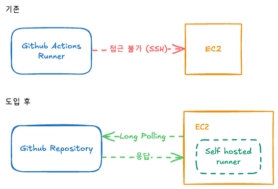 이전에는 Github Actions runnner의 IP 주소가 SSH 접속을 통해 자동 배포를 하고 있었지만, 이제는 인바운드 규칙에 걸려 차단당하기 때문이었다.